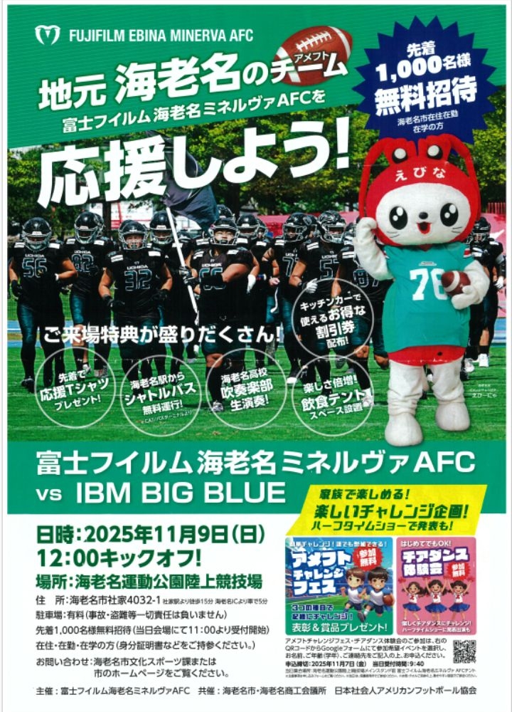 2025年11月9日(日)海老名運動公園陸上競技場にて、富士フィルム海老名ミネルヴァAFC 対 IBM BIG BLUEの試合が開催されます。