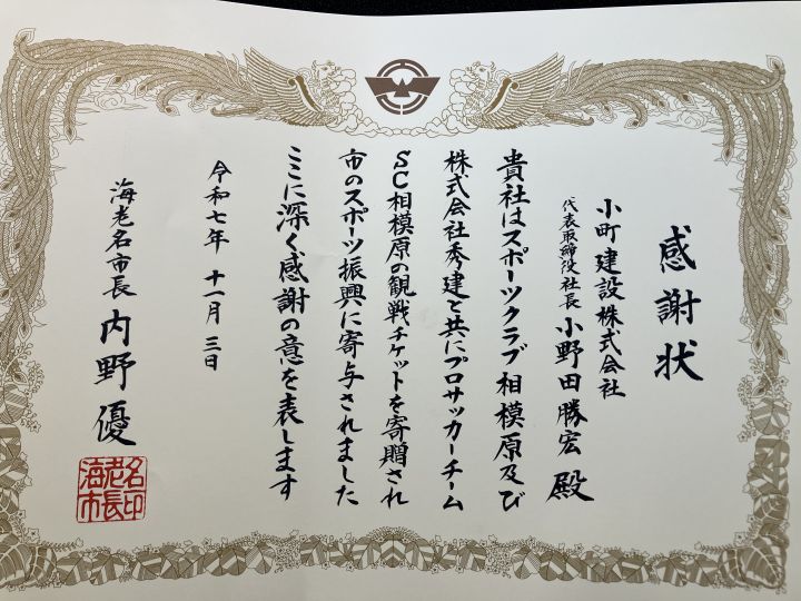 SC相模原 海老名市ホームタウン デー観戦チケット寄付に対しまして、内野市長より感謝状をいただきました。